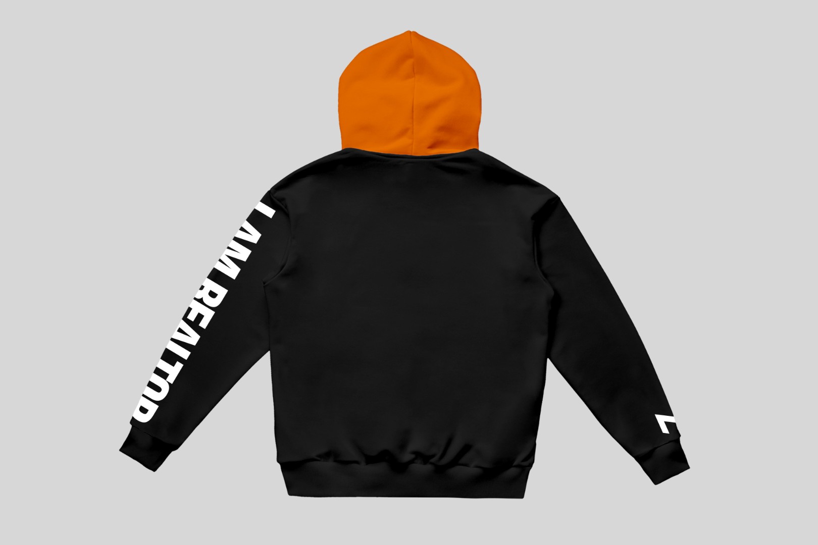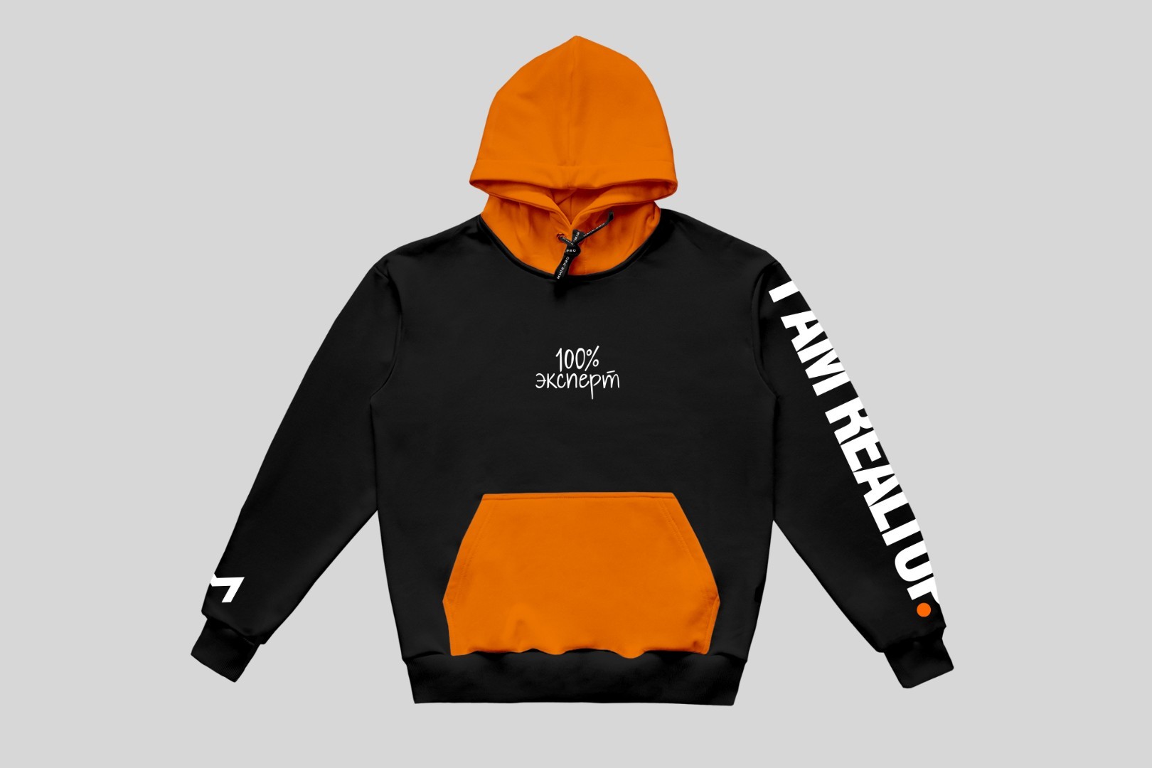 В этой худи вы всегда попадаете в ТОП! Черное худи свободного фасона с надписью "I AM REAL TOP." на рукаве. Метод нанесения - сублимация. Надпись "100% эксперт" и логотип на рукаве нанесены методом машинной вышивки.